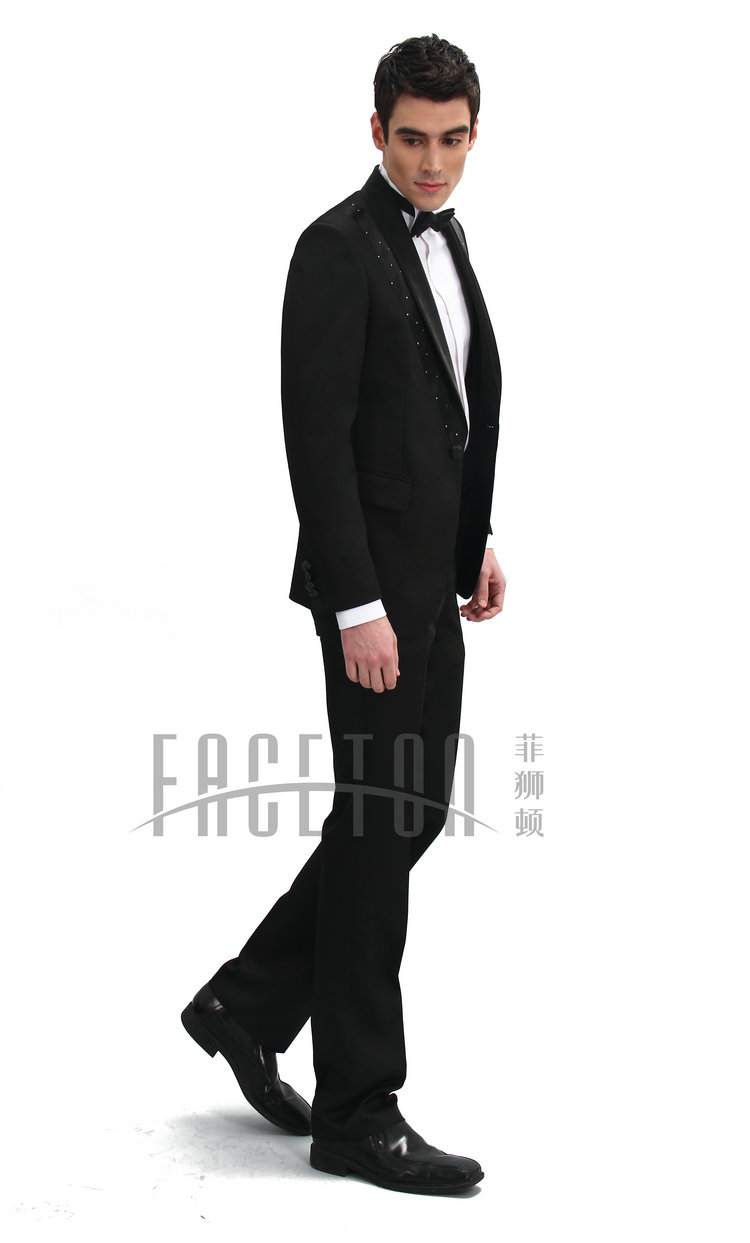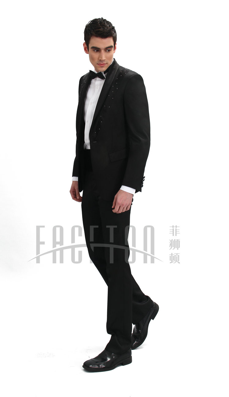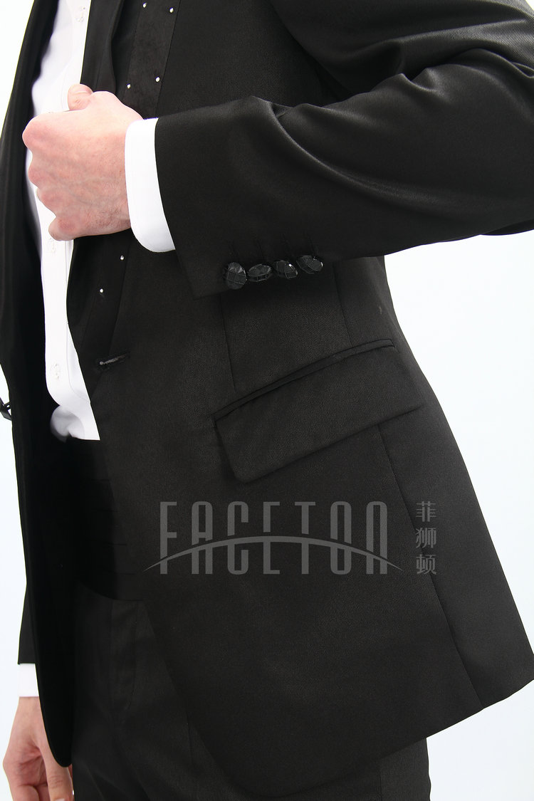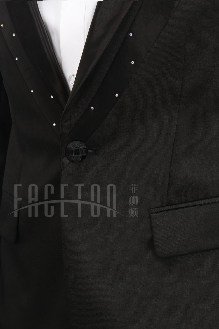 A blend of silk, polyester and wool, shawl lapel with black silk satin finish, single button, only size 44, 46, 48,50 available.
